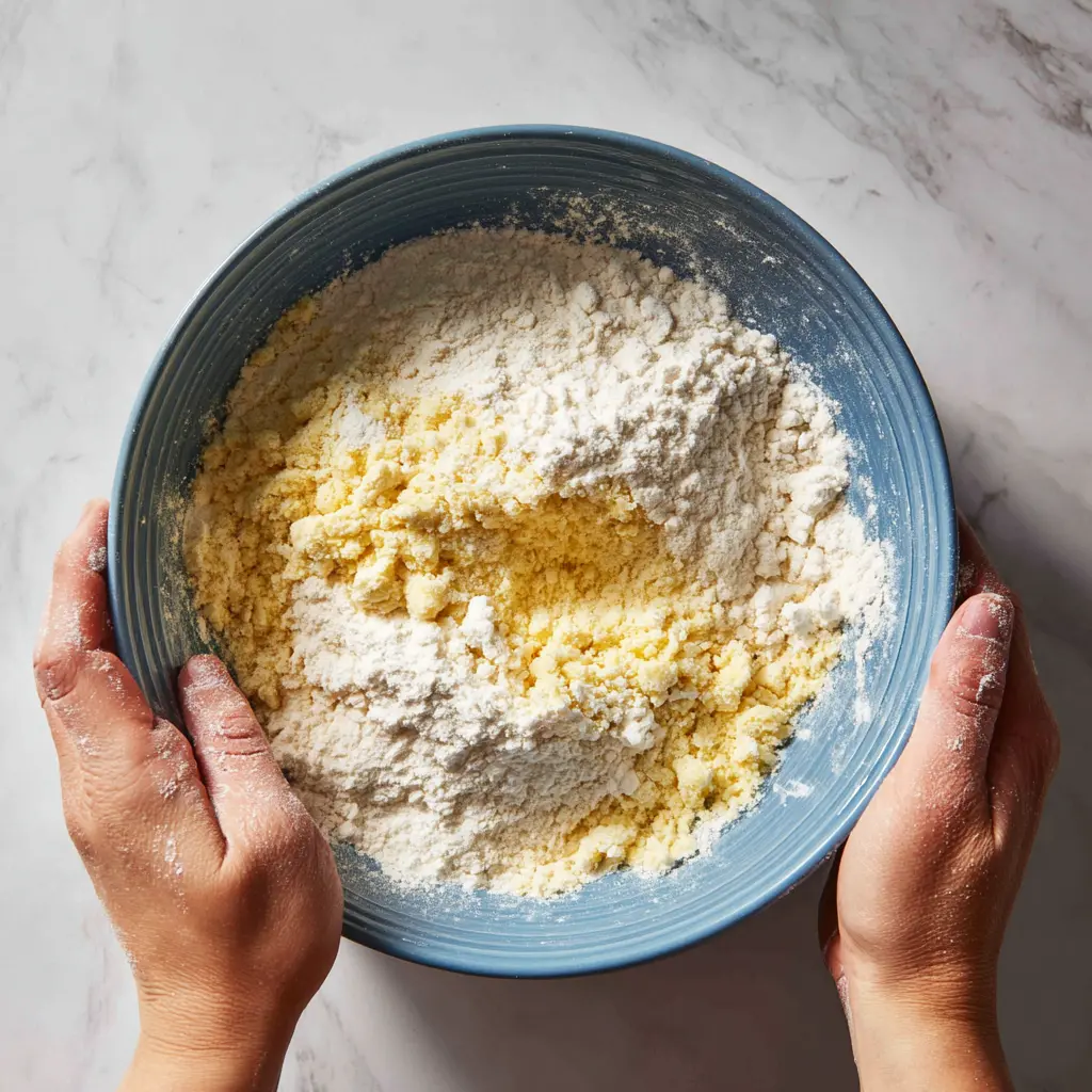 - Cut in Butter: Add the cold butter cubes to the flour mixture. Using a pastry blender, your fingertips, or a food processor, cut the butter into the flour until the mixture resembles coarse meal with some pea-sized pieces of butter remaining.